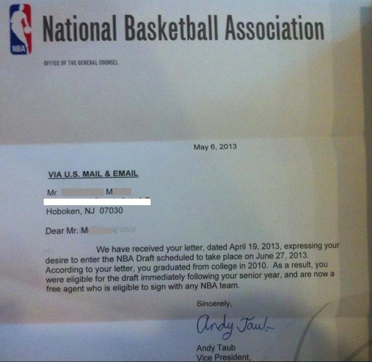 One user on Reddit “nemoran” posted this above photo of a reply he got from NBA Vice President, Andy Taub, after he declared himself eligible for June 27th...