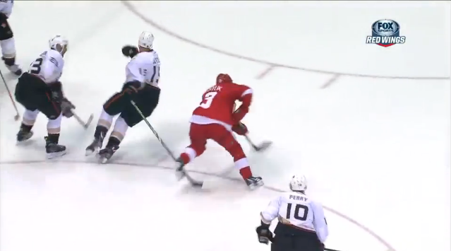 Late in the first period the Detroit Red Wings had the puck deep in the Anaheim Ducks zone when this fantastic play happened. Wings...