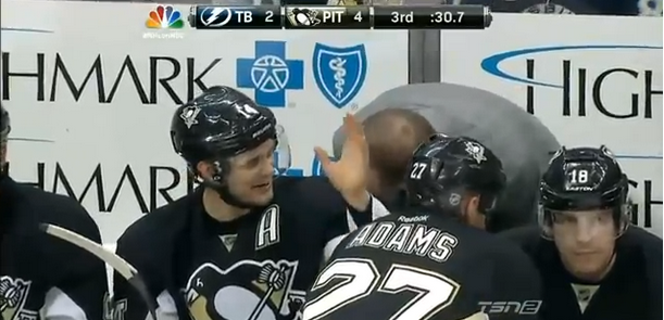 Pittsburgh Penguins forward Chris Kunitz jumped in the air to try and catch a puck to keep his head coach Dan Bylsma from being...