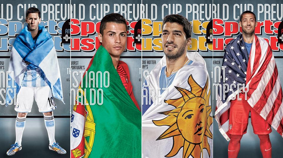For its preview issue of the World Cup, Sports Illustrated has Lionel Messi, Cristiano Ronaldo, Luis Suarez and Clint Dempsey with a flag representing their respective countries wrapped around themselves. June 12th can’t come soon enough.